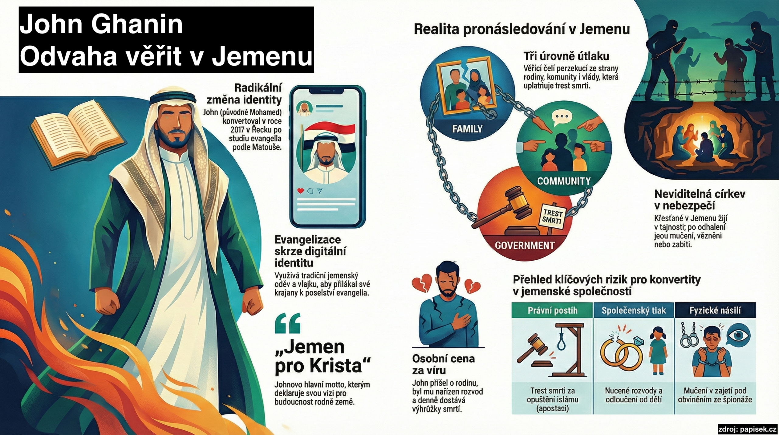 Tento rozhovor představuje životní příběh Johna Ghanina, bývalého jemenského muslima, který během svého uprchlického pobytu v Řecku konvertoval ke křesťanství. Jako vlivná osobnost na sociálních sítích nyní šíří evangelium v arabštině, ačkoliv za toto rozhodnutí zaplatil ztrátou rodiny a neustálými výhrůžkami smrtí. Text osvětluje extrémní nebezpečí, kterým čelí věřící v Jemenu, kde je opuštění islámu trestáno smrtí a vede k tvrdé společenské perzekuci. John popisuje svou cestu od agnosticismu k hluboké víře v Ježíše Krista, která mu přinesla vnitřní pokoj navzdory neustálému pronásledování. Zároveň vyzývá mezinárodní společenství k modlitbám za mír v jeho rodné zemi a za ochranu tajných křesťanských komunit. Celý pramen slouží jako silné svědectví o náboženské svobodě a osobní odvaze v jednom z nejuzavřenějších regionů světa.